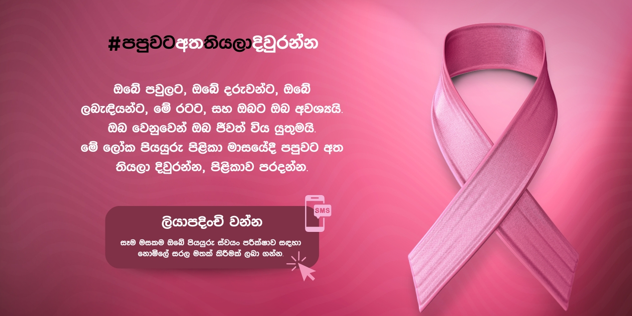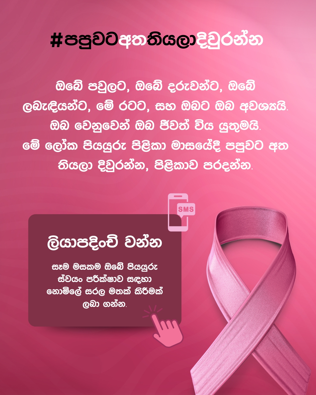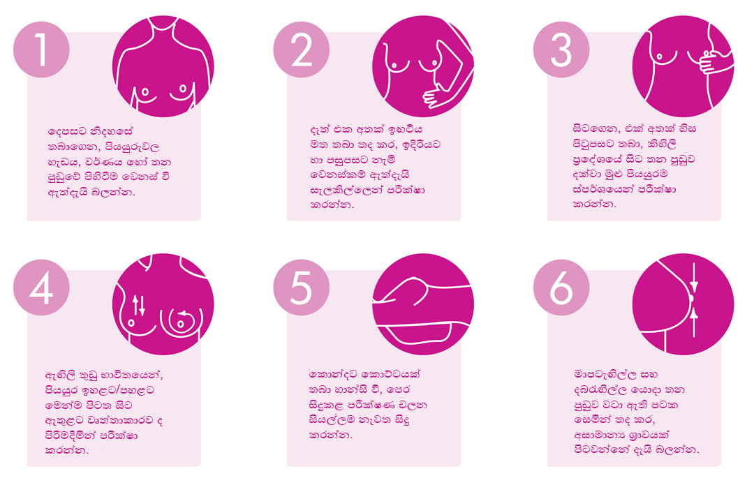 අපගේ නොමිලේ SMS මතක් කිරීමේ සේවාව සඳහා ලියාපදිංචි වන්න. එවිට සෑම මසකම ඔබේ පියයුරු ස්වයං පරීක්ෂාව සිදු කිරීමට මතක් කරමින්, සරල කෙටි පණිවිඩයක් ඔබට ලැබෙනු ඇත.